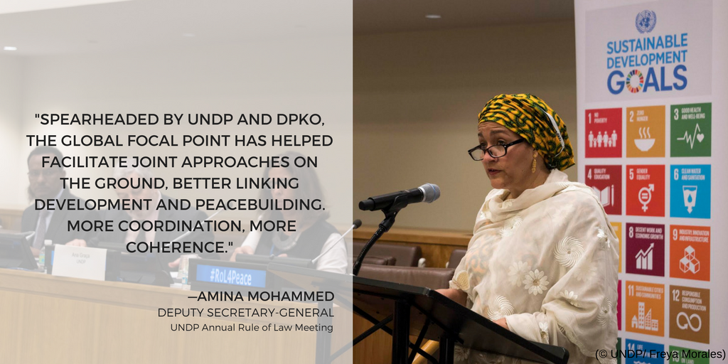 Положительным примером комплексного и ориентированного на практический результат подхода является работа Глобального координационного центра по вопросам верховенства права (ГКЦ). ГКЦ, учрежденный в 2012 году Генеральным секретарем Организации Объединенных Наций, представляет собой координационную платформу, призванную повышать согласованность и эффективность общесистемной поддержки верховенства права в рамках миссий, вне миссий и в условиях переходного периода. В Центральных учреждениях Организации Объединенных Наций работа ГКЦ ведется под совместным председательством Департамента миротворческих операций и Программы развития Организации Объединенных Наций, а в состав ГКЦ входят такие партнеры, как Подразделение по вопросам верховенства права в составе Канцелярии Генерального секретаря (КГС), Управление Организации Объединенных Наций по наркотикам и преступности (УНП ООН), Управление Верховного комиссара Организации Объединенных Наций по правам человека (УВКПЧ), Управление Верховного комиссара Организации Объединенных Наций по делам беженцев (УВКБ ООН), структура «ООН-женщины» и другие структуры системы Организации Объединенных Наций, которые совместно преследуют общие цели.