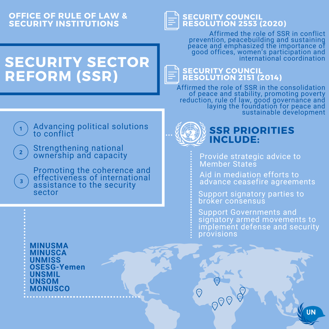 За последние десять лет Совет Безопасности выдал мандаты на проведение реформы сектора безопасности, которые включают в себя ряд обязательств, в том числе содействие национальному диалогу, усиление гражданского надзора и управления государственными финансами (Ливия, Гвинея-Бисау и Сомали), управление сектором безопасности, реформу полиции, реформу пенитенциарной системы, реформу сектора обороны (Центральноафриканская Республика, Демократическая Республика Конго и Ливия), наращивание потенциала, создание механизмов координации национальной безопасности (Демократическая Республика Конго, Ливия, Мали и Сомали) и такие более привязанные к конкретной ситуации области, как управление охраной границ (Мали) или безопасность на море (Сомали), а также такие сквозные вопросы, как учет гендерной проблематики в секторе безопасности.